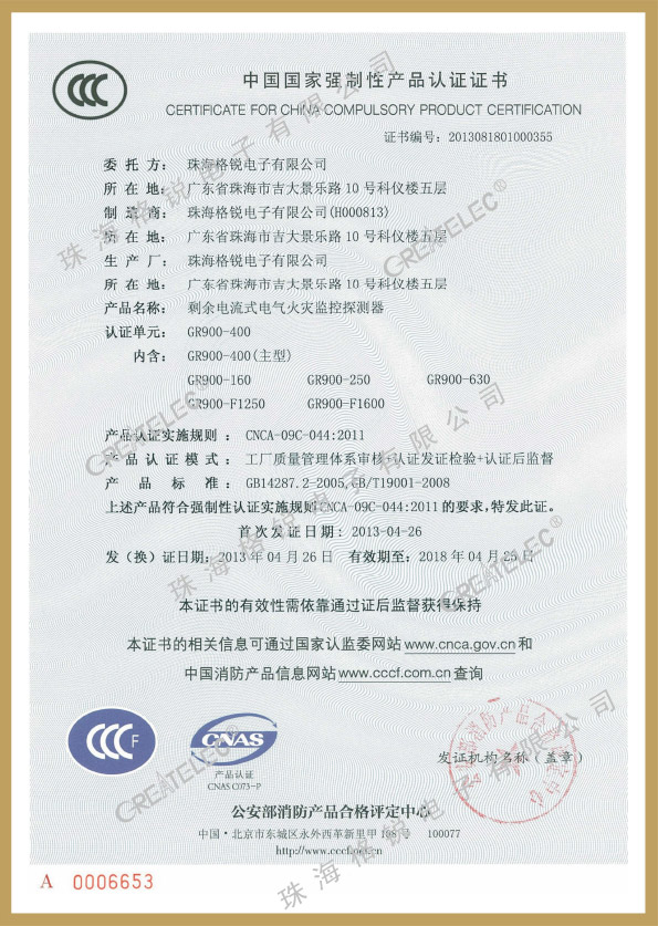 當前位置: 公司資質(zhì) 型式檢驗報告/3C證書(shū) > 電氣火災3C證書(shū)